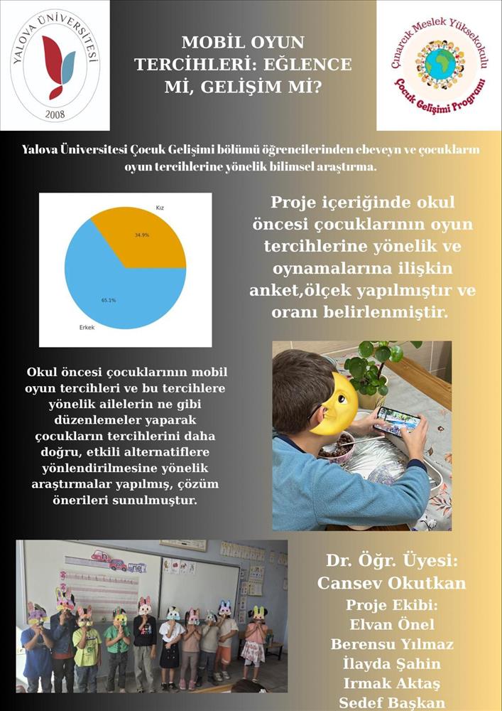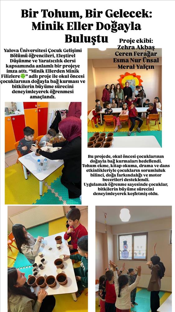 Yalova Üniversitesi Çocuk Gelişimi Programı 1. sınıf öğrencileri, 2025–2026 eğitim-öğretim yılı güz dönemi kapsamında Dr. Öğr. Üyesi Cansev Okutkan tarafından yürütülen “Eleştirel Düşünme, Yaratıcılık ve Girişimcilik” dersi çerçevesinde çeşitli farkındalık projeleri gerçekleştirmiştir.